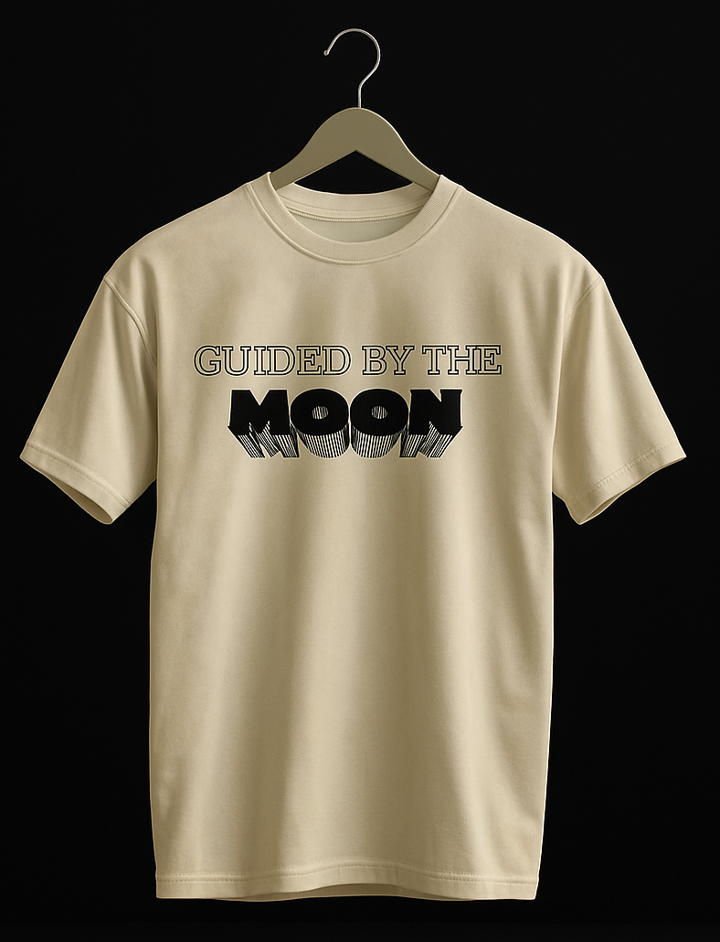 A bold cosmic-inspired text design “Guided by the Moon” created for T-shirt printing.